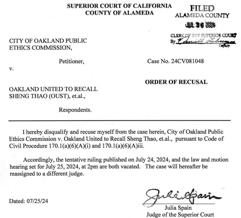 In an unexpected move Friday morning, Alameda County Superior Court Judge Julia Spain recused herself from a suit to compel the proponents and financiers of the recall of Mayor Sheng Thao to produce documents for subpoenas. The Public Ethics Commission [PEC] brought the suit after the recall proponents, among them former Judge Brenda Harbin Forte, and principals in an allied organization Foundational Oakland Unites [FOU], refused to comply with the PEC’s investigative subpoenas for communications between the network of financiers and proponents.