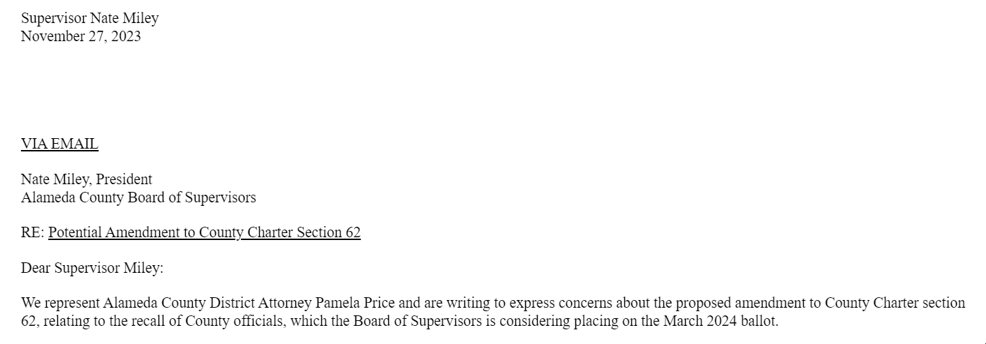 James Sutton, a prominent election lawyer representing ALCO DA Pamela Price sent a letter to the board last Monday questioning decisions made by Registrar of Voters [ROV] Tim Dupuis as he creates a viable recall from a patchwork of constitutionally-valid local and state law.