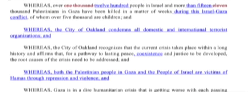Oakland’s City Council unanimously passed a neutral resolution calling for a ceasefire in the nearly two month old Israeli invasion of Gaza at a special meeting Tuesday night. The resolution calls for a cessation to fighting, notes the numbers killed on both sides of the conflict, calls for a release of all hostages and protection of human rights for all civilians. Notably, the resolution issues no condemnations to any parties. During the meeting, CM Carroll Fife, who authored the resolution, said the text is meant to provide a measured approach that expresses what the council supports, not what it doesn't—Israel is mentioned only once in the resolution, as a site of the loss of life and violence, but not as an instigator of violence. So too, are no Palestinian actors named.