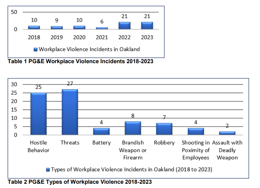 In arguing for an expanded scope, the new legislative report from DPW presents PG&E claims of increases in “workplace violence” and unspecified work site issues since 2022. But the majority of the “violence” described in the new report is described as “hostile behavior” and “threats” not actual physical violence, which appear to be low over a period of five years. The data is not disaggregated, and does not have a source listed, i.e, police reports vs PG&E’s own complaint system.