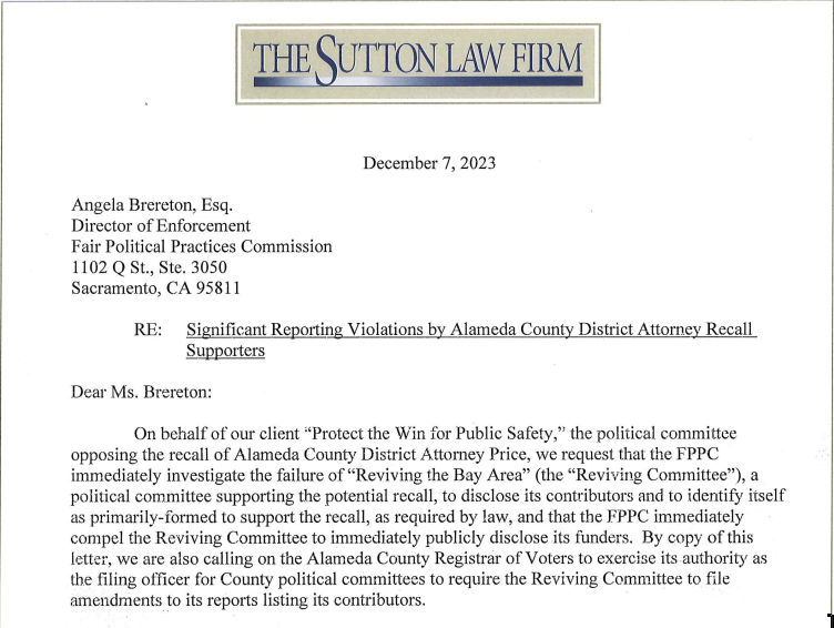 The untransparent finance activity that would appear designed to hide major funders of the recall caught the attention of "Protect the Win", the Price-linked campaign countering the recall. On December 7, an attorney for the campaign sent a letter to the Fair Political Practices Commission [FPPC], the California regulatory agency that oversees campaign financing, demanding an investigation of RBA/Supporters reporting practices. The letter alleged that the group is a committee primarily focused on the recall, but that it failed to report quarterly as it should have under California law.
