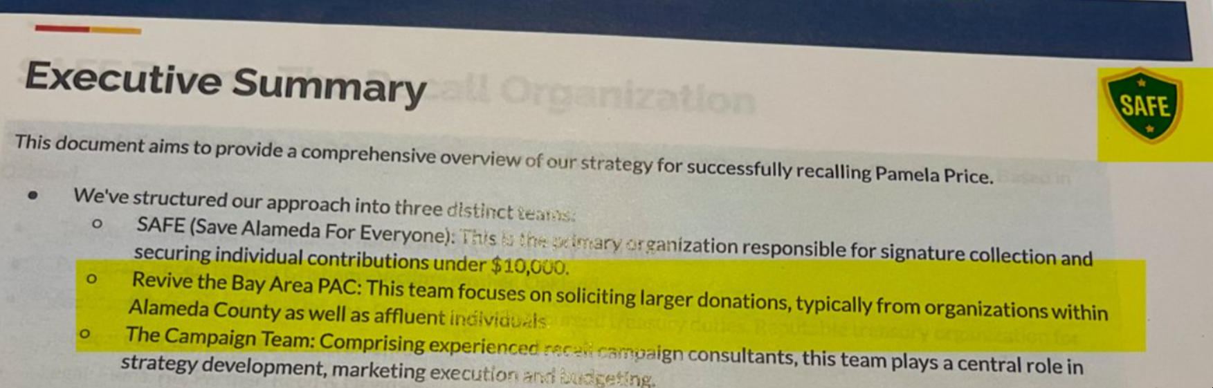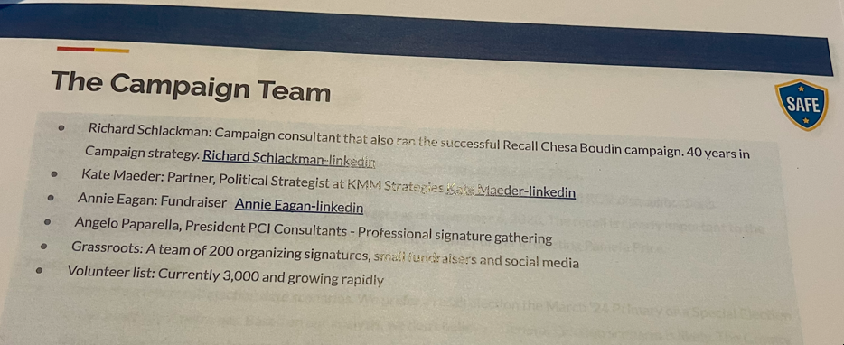 SAFE was co-founded by Carl Chan, Brenda Grisham and Dreyfuss last August. At the time, Dreyfuss was listed as a principal officer in the SAFE committee. But shortly after SAFE’s founding, Dreyfuss’ name disappeared from SAFE's list of officers and Dreyfuss started another finance committee dubbed Reviving the Bay Area [RBA]without any explanation from either group. Unlike SAFE, RBA was formed as a general purpose committee. Those kinds of committees lack quarterly requirements like SAFE has and that meant that RBA/Supporters contributors would remain unknown until January, well into the legal recall timeline, and with little over a month left until the signature-gathering deadline.