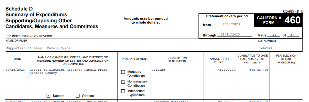 Astonishingly, according to the reports, Dreyfuss contributed one-third of the total recall funds raised in 2023, $390K. The total amount raised by both groups in 2023 was $1.168MM, and their combined expenditures by the end of the year were $1.67MM, including deferred payments. 497 forms that are required to be turned in whenever a committee contributes a large amount in proximity to an election show that RBA/Supporters has spent another $545K on SAFE since the start of 2024. That means that the total amount spent, including payments that are still due, could be by the time of this writing as much $2.2 MM [2].