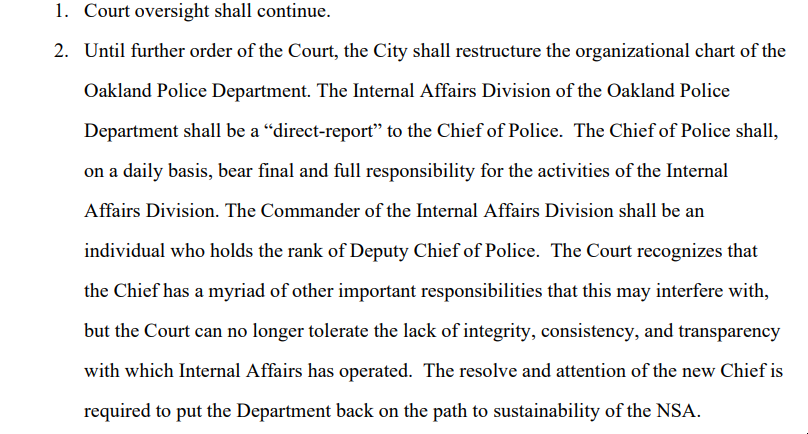 The order likely is a response to statements made by the Chief who presided over the IAD failures at the heart of the court intervention, Lerrone Armstrong. In his defense of his sign off on the Chung investigation, Armstrong has repeatedly said that it was not his role to be aware of the details of the cases. The report on Chung found Armstrong's claim to be "not credible." During the NSA meeting the day before, Orrick was already circling around the idea of restructuring IAD directly under the Chief and he identified the IAD’s Tran investigation as the direct reason the OPD would remain under oversight.