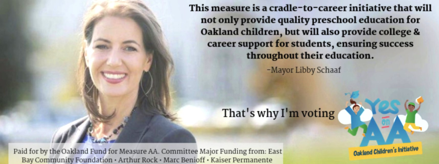 Two of the committees saw their goals brought to fruition. Brooks lost her 2018 re-election to Schaaf ally and favorite Loren Taylor. Measure AA ultimately passed after a legal battle on the definition of its tax status. AA was directly linked to Schaaf and she often appeared in its literature, ads and events, giving her an additional source of promotional marketing while she ran for and won her second term in office.