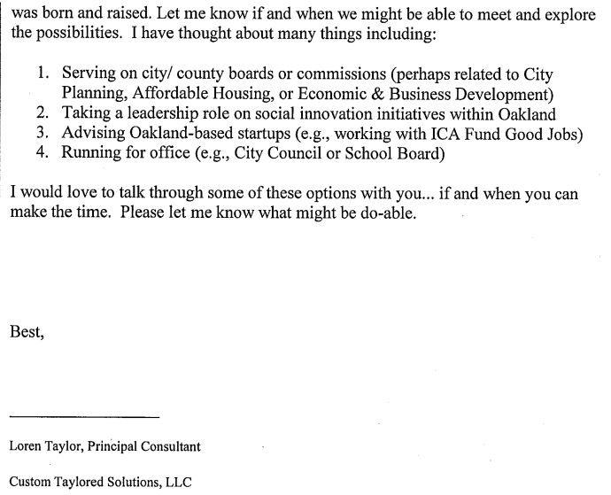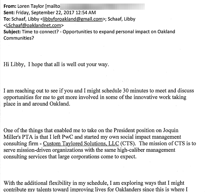 At Schaaf’s request, Linney produced the relentlessly disparaging public ad campaign and targeted voter activation that helped Loren Taylor win Brooks’ seat. Schaaf apparently approved the plan. The settlement goes on to describe how Schaaf directed the selection of a “public-facing” proponent for the campaign—someone who would be “believable as a decision-maker on this,", in Linney's words.