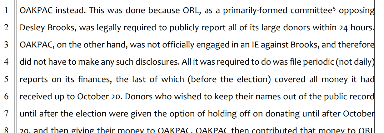 Schaaf’s direct role was perhaps most visible in the anti-Desley Brooks PAC, ORL, according to the PEC. The settlement notes that Schaaf was the creator of the anti-Brooks committee, a group she organized and developed from scratch with the help of a friendly campaign consultant Doug Linney. Linney, a Schaaf go-to consultant, recounted to the PEC that she invited him into the effort, saying, “Let's do an IE campaign against Desley, and let me see if I can get some other folks involved to make it happen.”
