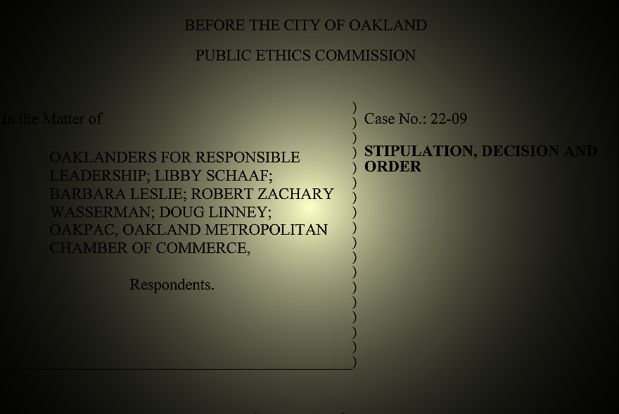 OakPAC, the Chamber of Commerce’s standing campaign finance committee, was used as a “pass-through” committee with the effect of the donors not appearing on ORL paperwork or official documentation, according to the PEC. The settlements describe the role as one negotiated by Schaaf with Leslie and Wasserman. The contribution option was explicitly proposed to major donors by ORL.