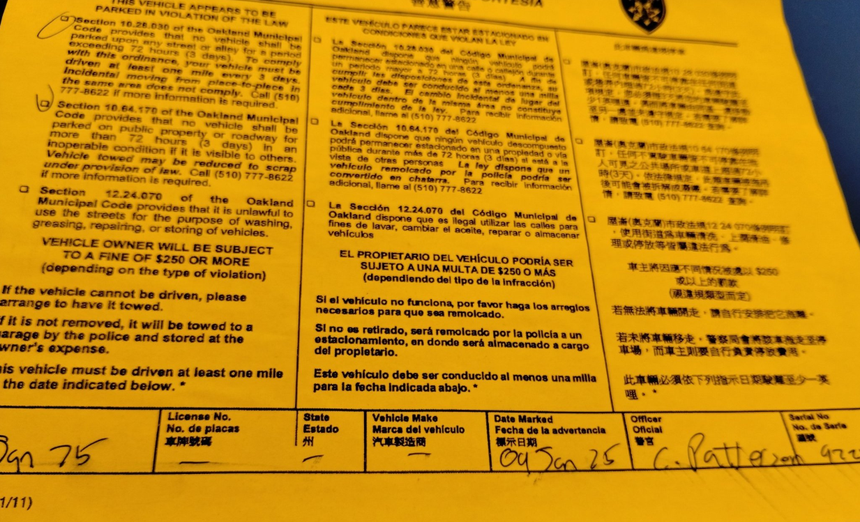 Several vehicular residents were stickered by OPD—the violation appearing to be solely exceeding 72 hour parking limits. One resident told this reporter that OPD officers claimed they’d run out of stickers but would still tow all vehicles remaining on E 12th Street from 24th to 28th Avenue on Sunday.
