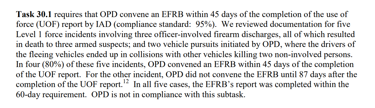 OPD pursuits come up frequently in Negotiated Settlement Agreement [NSA] Independent Monitor reports from the period between 2008 and 2011 along several vectors of concern. One area of concern for the monitor was risk assessments, where the number of high speed pursuits by officers was not being adequately assessed as a potential red flag of officer behavior, for example.