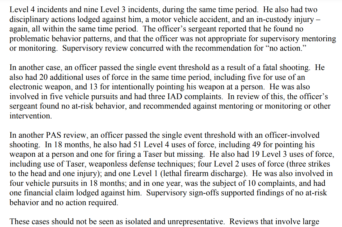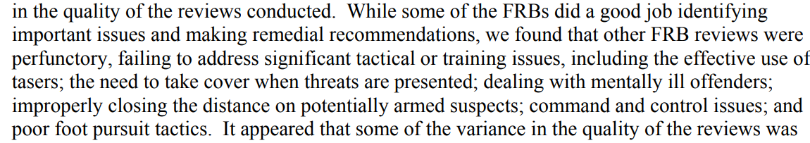 A specific area of focus in these years in the monitor's reports was the performance of force review boards in the evaluation of pursuits-related injuries and deaths, due to the sheer number of use of force related to pursuits. Prior to tightened policies on vehicle and foot pursuits, vehicular pursuits often ended in collisions and segued into foot-chases on side streets, backyards and alleys, with subsequent shootings, and often-times killings, of a suspect a common occurrence.