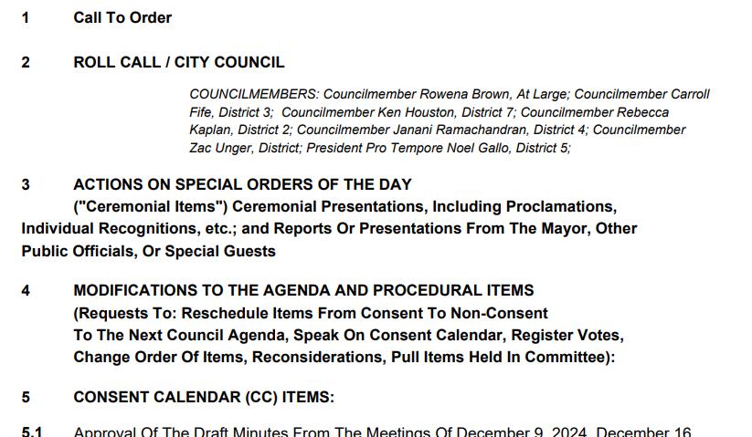 Reed, hesitated before replying, “Sure, I’ll do it.” and continuing with what has been for recorded memory, the role of the President to query fellow CMs on whether they’d like to move or withdraw items. The confusion was not over, however, because there was in fact a modification that Gallo had been asked to register for CM Rebecca Kaplan, apparently. Reed noted Kaplan's request to consider the new plan for Estuary Park separately from the consent calendar [likely due to a potential conflict of interest for Kaplan as she lives nearby]. Reed had to remind Gallo he was required to do this. But in doing so, Gallo misrepresented Kaplan’s recusal as an abstention. Reed corrected him verbally for the record.