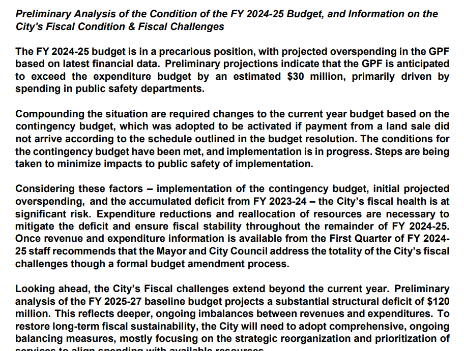 The report also has a brief prospectus of the coming Q1 report. It notes that the City Administrator has already started preparing some measures outlined in the “contingency budget” now that the payment schedule in the Coliseum sale to AASEG has been changed—though not at the breathless rate claimed by some Council members in recent social media posts. That contingency plan, if pursued to some of its logical conclusions, could mean cuts to both fire and police.