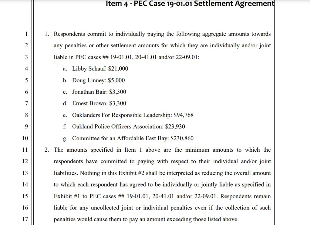 Weeks ago, Russell warned Commissioners that sending the settlements back for more negotiation could mean an interminable timeline that could see the matter end up in court. The issue was heightened by the fact that Russell handed in his resignation within days of the decision. But Russell seems to have been able to wring further concessions out of the parties, and added individual assessments for Schaaf and others. Schaaf will pay at least $21K in the three settlements according to the new structure [several others are still to be adjudicated due to logistical issues, like the need for a board to approve the settlements].
