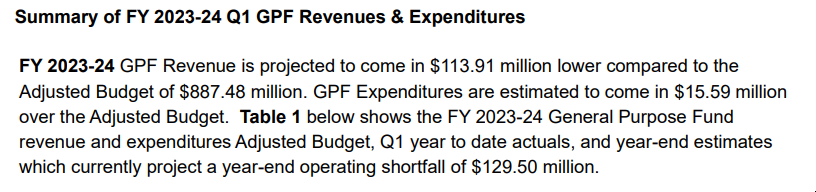 —Oakland’s Revenues May be Lower than Projected, Expenditures Higher in FY 23-24 in Preliminary Projections: While 1st quarter predictions are very unreliable, the 1st quarter report suggests that Oakland’s revenues are performing more poorly than expected, while expenditures are going to be slightly higher than predicted.