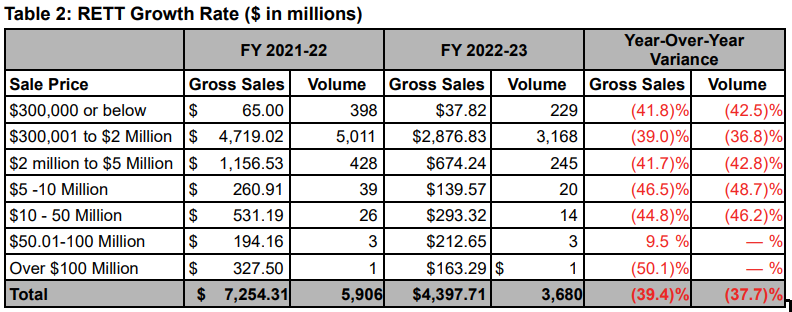 —Real Estate Transfer Tax Revenue for FY 23-24 Projected to be Far Lower Than Budgeted: Lower than expected RETT is one of the factors contributing to a shortfall. RETT in FY 23-24 may be about $20 MM lower than what was assumed in the FY 23-25 budget making process, according to the report, a relatively large shortfall of 18.8%. The smaller figure reflects a cooling of the Bay Area housing market due to external economic forces. The report claims that the projections for FY 23-24 were made before a decline in home sales was noted in late FY 22-23, But the report also notes that there’s some indication the housing market will rebound. As always, RETT remains unpredictable, and generally fluctuates, especially if a large commercial property changes hands.