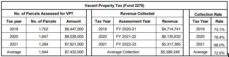 That should have resulted in an average of $7,432,000 MM in vacant property taxes collected yearly, but average yearly revenue is only about $5.3 MM, according to the report. The disparity between those two figures gets very little attention in the report, except for highlighting the 10 exemptions Council added to the tax law—but there’s no data on whether assessed property owners are failing to pay taxes.