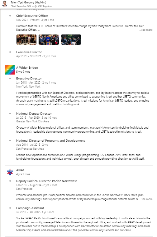 Tyler Gregory, the SF JCRC’s Director, has spent his professional life in non-profit lobbying organizations with the specific focus of Israeli-American relations. Gregory was AIPAC’s Deputy Political Director, Pacific Northwest from 2012 to 2014, and the director of a Wider Bridge, an organization that seeks to link LGBQT issues to Israel from 2014 to 2020. He became director at JCRC in 2021.