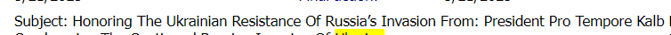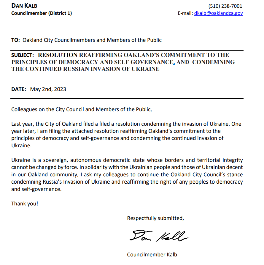 Regardless, Ukraine has been the subject of two Oakland City Council resolutions—CM Dan Kalb was the sole author of the second support resolution for Ukraine which he brought to Council with no co-sponsors. It appears Kalb's original resolution likely went further than simple support, and celebrated Ukraine's military effort, as the item was scheduled with the title "Honoring The Ukrainian Resistance Of Russia’s Invasion". That means that it was likely the original title of the first legislation Kalb attempted to schedule.