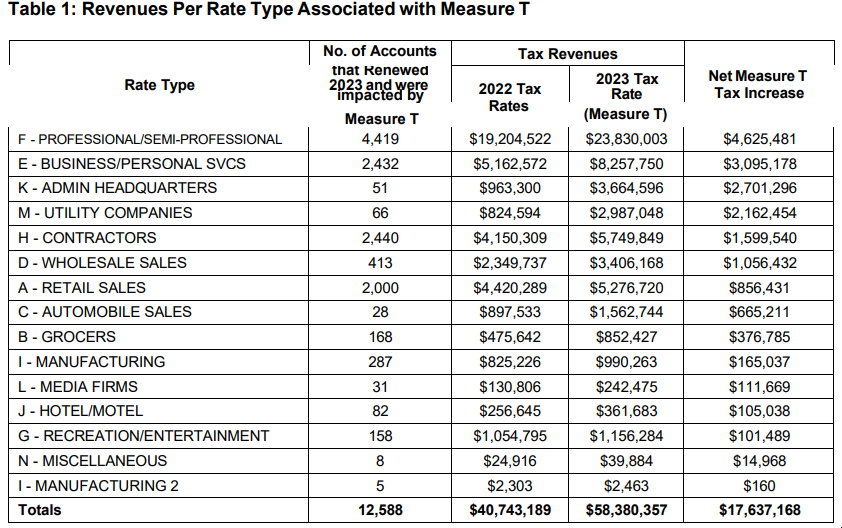 The City collected about $17.6 MM in additional taxes from the wealthiest corporations subject to an increase, which is about $3.3 MM lower than the estimates predicted in the ballot measure put before voters. The City will spend about $1.3 MM implementing the new tax structure. The City collected $58.3 MM with the new progressive tax rates—last year, under the old structure, the City collected $40.7 MM in business tax revenue.