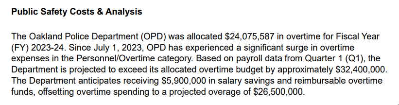 If the projection of even the lower amount proves to be accurate, however, the resulting audited overtime expenditure of over $50 MM would be Oakland’s largest overtime expenditure to date and one of its largest budget overages as well.