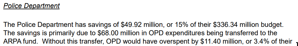 —OPD Overspent its FY 22-23 budget by $11.4 MM: Though the budgeting of ARPA funds continued to obscure police spending [the last year it will do so], the report clearly notes that the Oakland Police Department overspent its budget by $11.4 MM, despite historically low staffing throughout the 2022-23 fiscal year.