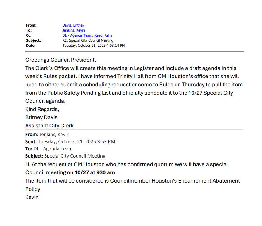 An attempt by CM Kevin Houston and Council Chair Kevin Jenkins to schedule a special council meeting with little advanced notice for Houston’s Encampment Abatement Plan failed at Rules Thursday. The legislation was originally introduced by Houston’s staff on the dais at 10/16 Rules, but at that meeting concerns about the availability of Council people, including Carroll Fife who is at a conference abroad, prompted Jenkins to hold off on scheduling the meeting to that date. Jenkins stated that he would poll CMs for availability for a potential date on Wednesday the 29th and, importantly, stated that a date had not been chosen. So in the meantime, the item was not scheduled, and a potential meeting not noticed to the public. Jenkins Chief of Staff has partnered with Houston on the legislation, though Jenkins has claimed he should not be considered a co-author. Notes from meetings between the D6 Chief of Staff and other CMs taken by a D6 staffer state that Jenkins originated the legislation.