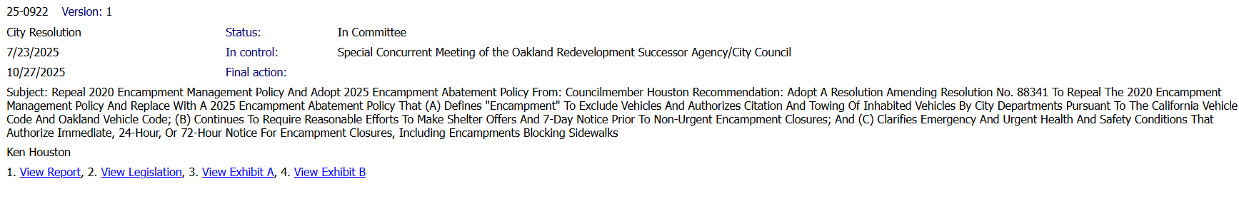 When last the public had heard about the legislation, it had been routed at the Special Public Safety Committee meeting also called for by Houston, after overwhelming public opposition to the proposal and the revelation that the language would put $20 MM in homelessness funds at risk. The item was placed on the Committee's "pending, no date specific" list, with proposed next step to schedule the item to another committee meeting after CMs had prepared amendments. Advocates have been waiting to see the item re-emerge on a Public Safety Committee agenda with amendments.