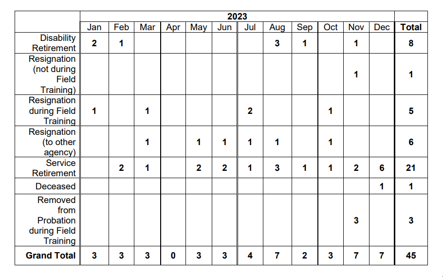 —A total of 45 officers left OPD in 2023. Most of the officers who left OPD last year retired, disability-retired, resigned/were released during field training. 6 left for another Law Enforcement Agency, and one sworn officer resigned. The report would suggest that no officers were dismissed, despite several stories that suggest several officers faced dismissal this year; it's likely those officers continue on the force while they appeal their discipline.