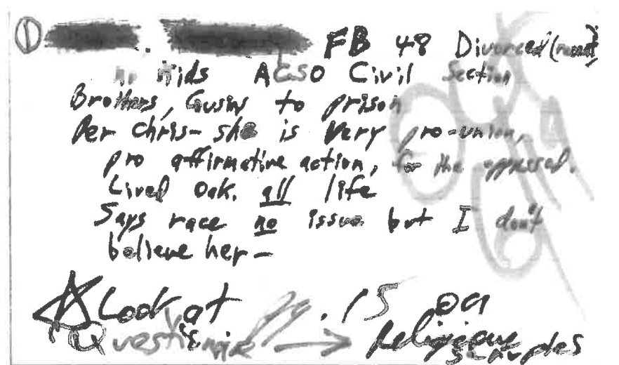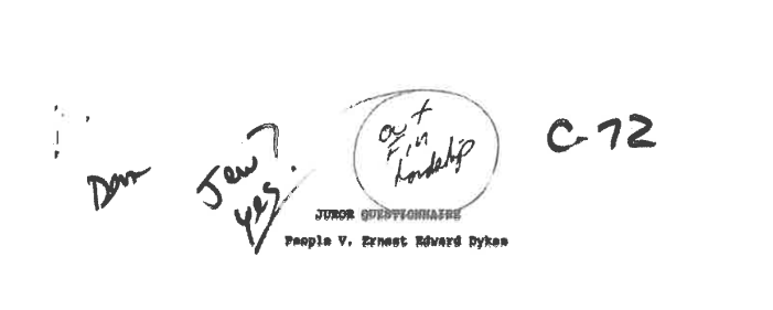 But in the process of deliberating the resentencing, Price’s office found alarming notes from the DA’s office reflecting an apparently open practice of excluding potential jurors based on their ethnicity. Price turned the notes over to the Dykes’ defense attorneys and Judge Chhabria—notes provided to this publication show prosecutor’s critiquing the race of potential jurors, along with what appears to be associated assumptions about their political beliefs. Price’s office said that 35 such cases had been identified with cases going back to the nineties.